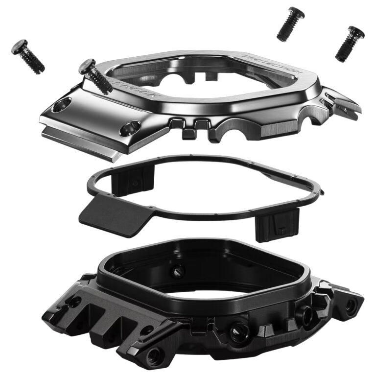 ベゼルとセンターケースを上下で連結した構造を開発。ケースサイドから見える造形が構造の美しさを強調。フルメタルながらG-SHOCKの耐衝撃基準をクリアし、気密性に優れたスクリューバックケースも採用しています。