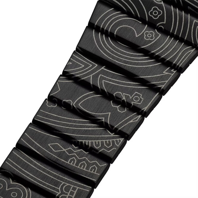 曲線が美しいクラシックなペイズリー柄をバンドと文字板にデザインしました。 レーザー刻印によって緻密に表現された柄が、繊細な美しさを添えています。